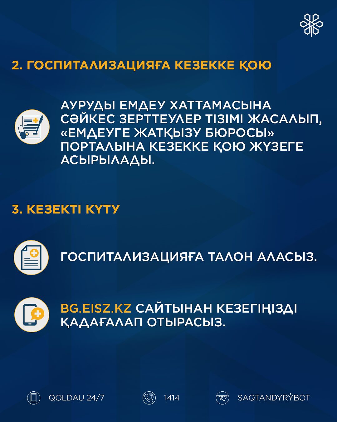 Жоспарлы госпитализация – бұл шұғыл медициналық араласуды қажет етпейтін созылмалы немесе басқа да ауруларды емдеу үшін пациенттің ауруханаға алдын ала жоспар бойынша жатқызылуы. Ол «Емдеуге жатқызу бюросы» порталы арқылы жүзеге асырылады.