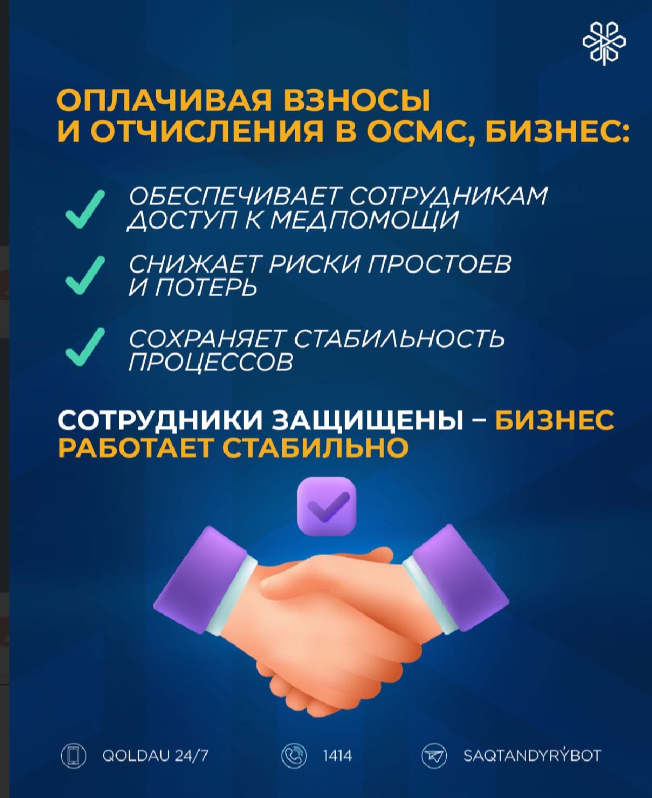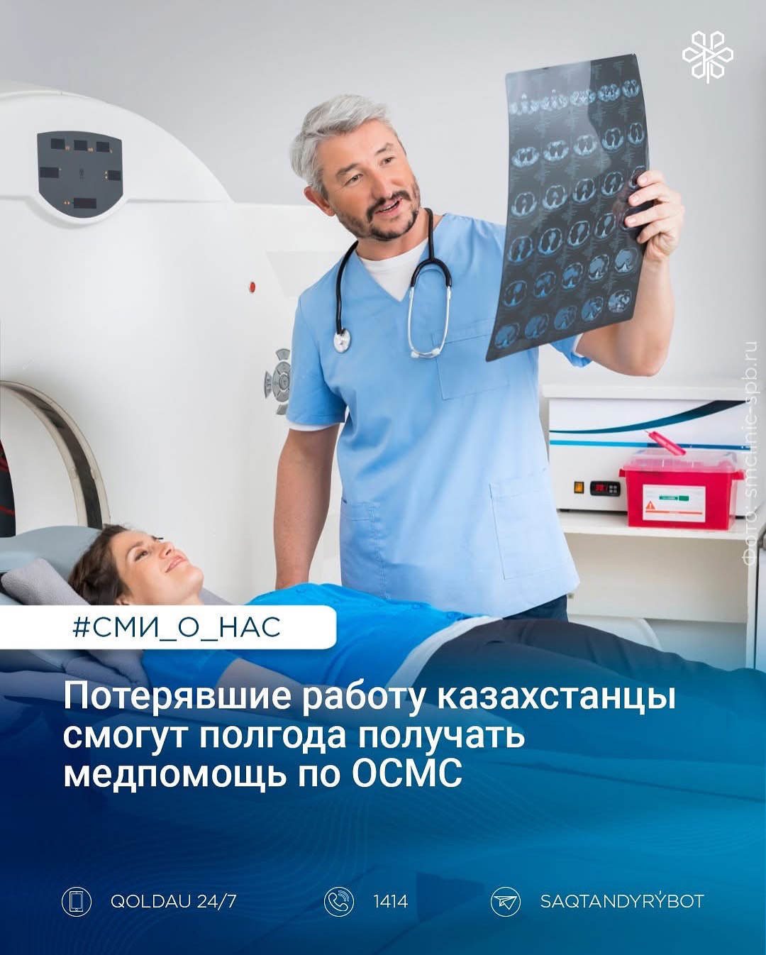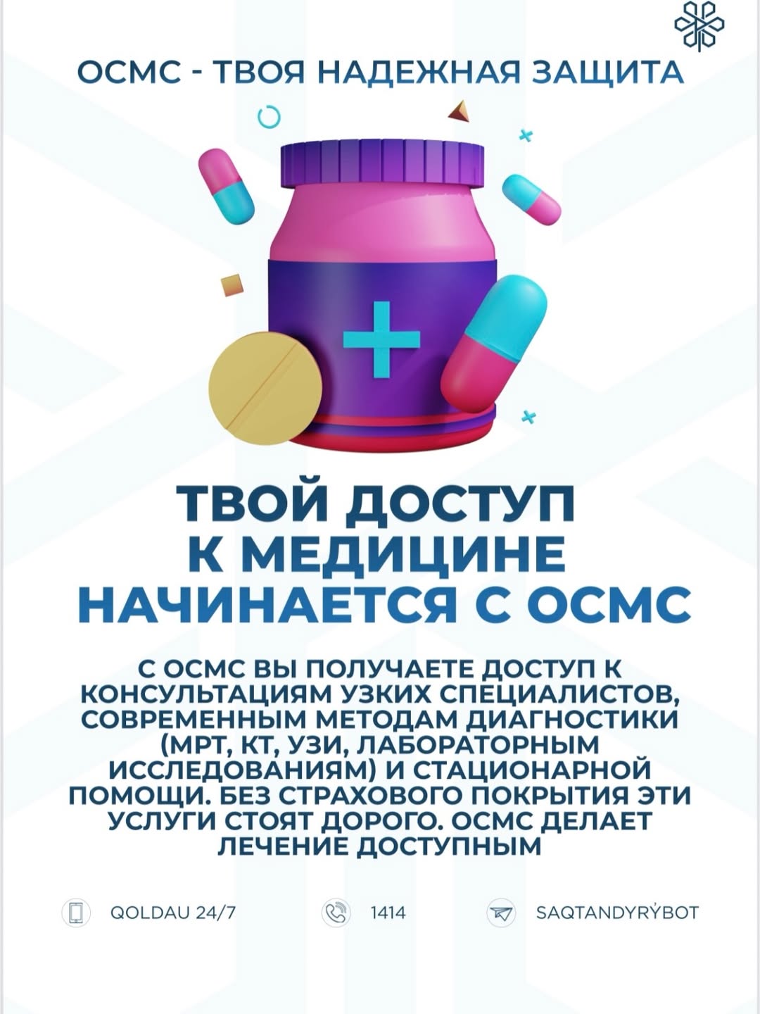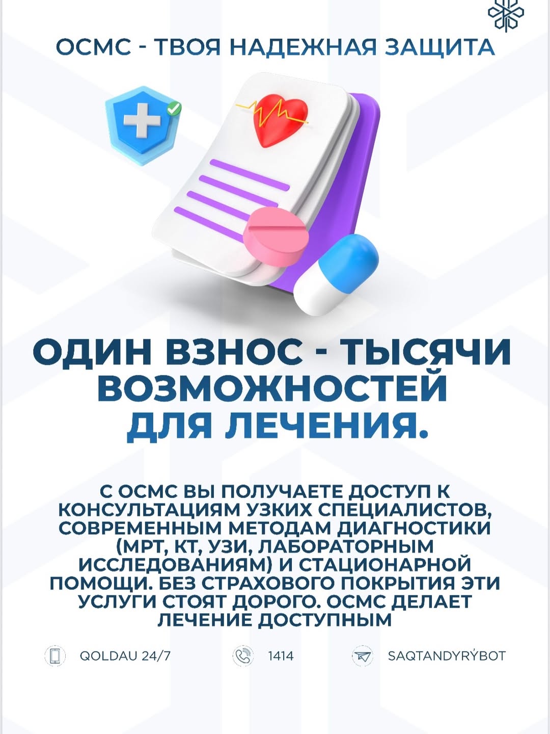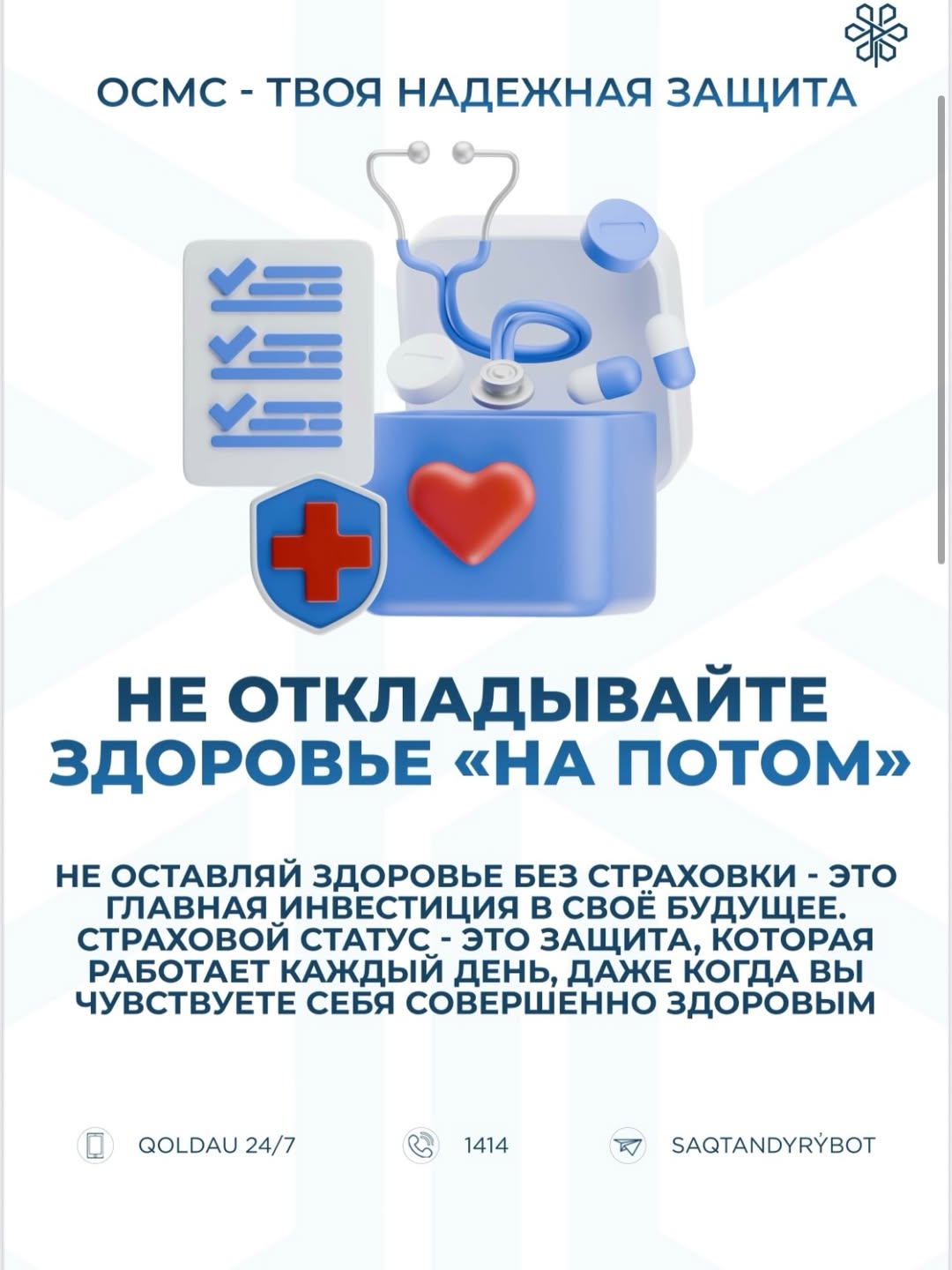 За более подробной информацией вы можете обратиться в Фонд социального медицинского страхования удобным для вас каналом обратной связи: официальный сайт msqory.kz, контакт-центр 1414, мобильное приложение Qoldau 24/7 и SaqtandyrýBot в Telegram.