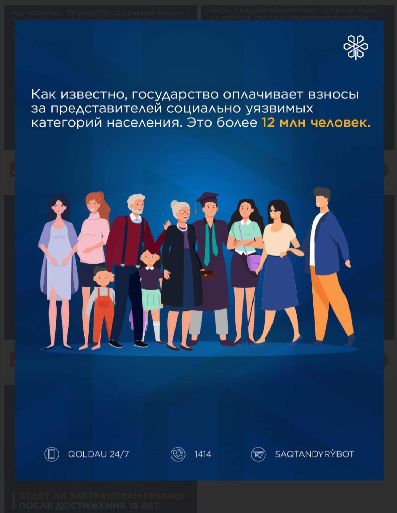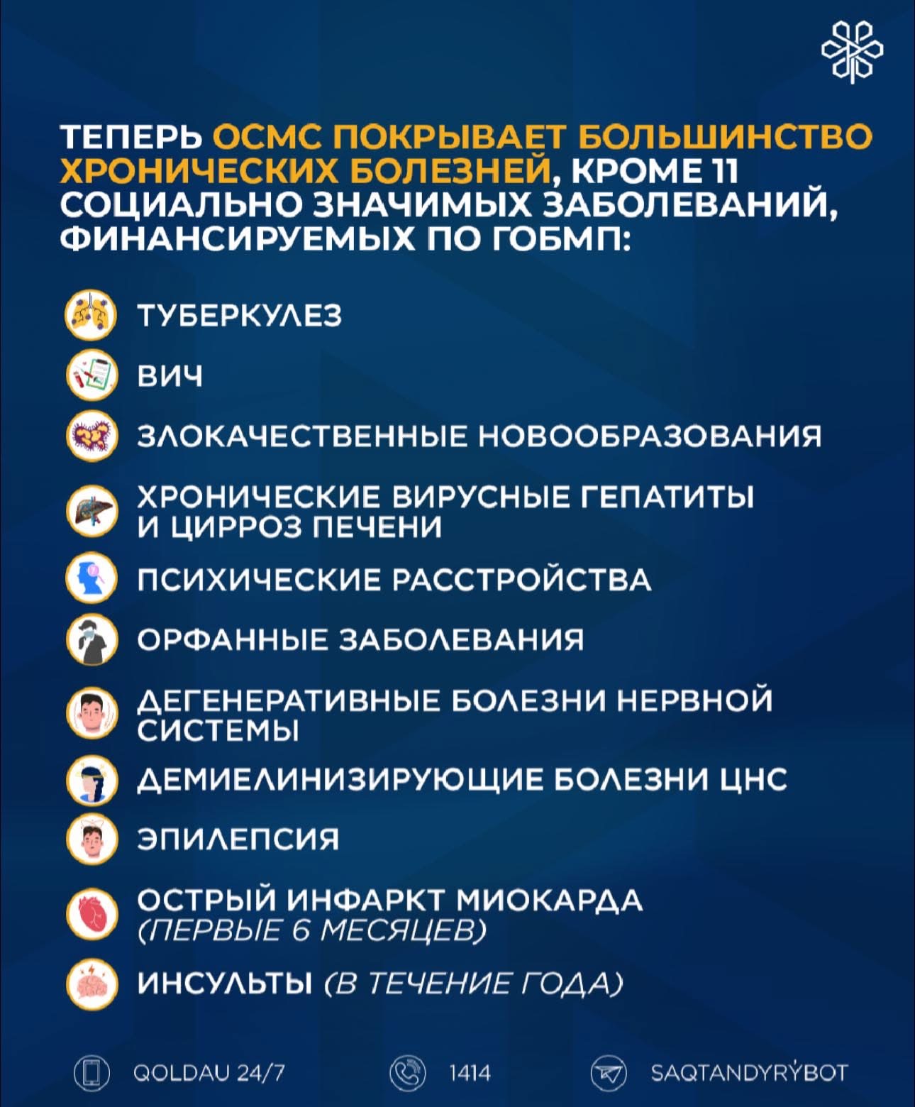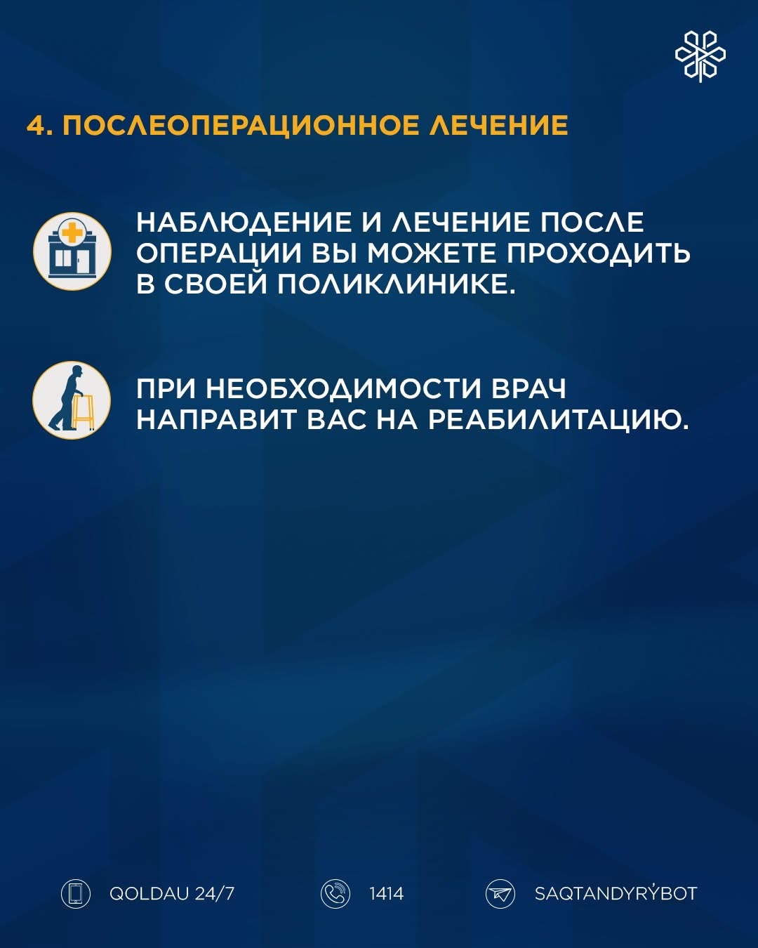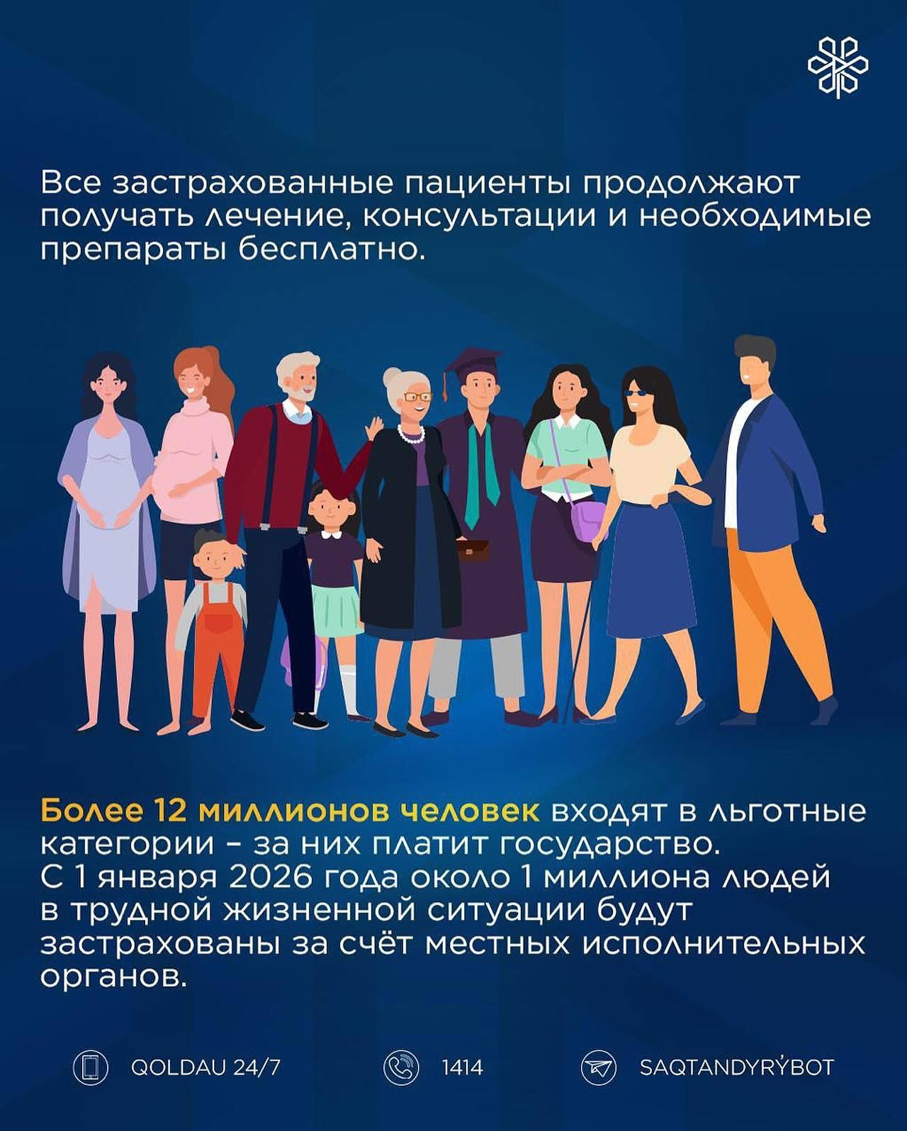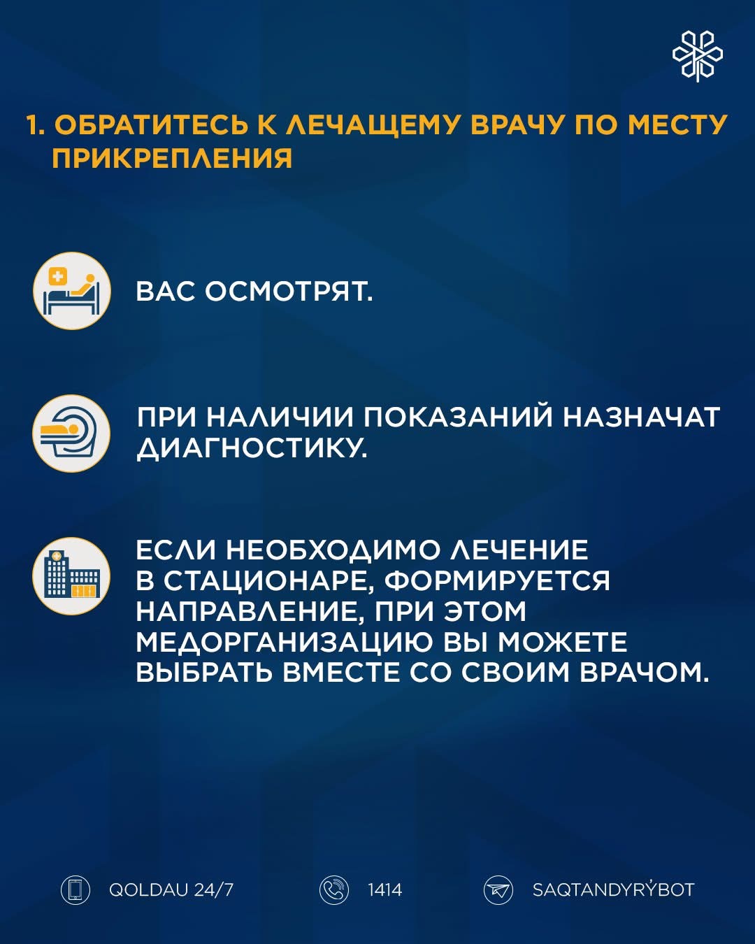 За более подробной информацией вы можете обратиться в Фонд социального медицинского страхования удобным для вас каналом обратной связи: официальный сайт msqory.kz, контакт-центр 1414, мобильное приложение Qoldau 24/7 и SaqtandyrýBot в Telegram.