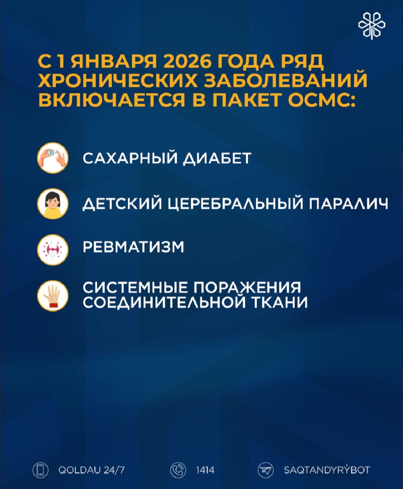 Со следующего года в пакет ОСМС перейдет наблюдение и лечение в поликлинике, а также в стационаре ряда хронических заболеваний, в том числе артериальной гипертензии, сахарного диабета, церебральный паралич, ревматизма, системных поражений соединительной ткани, заболеваний почек.