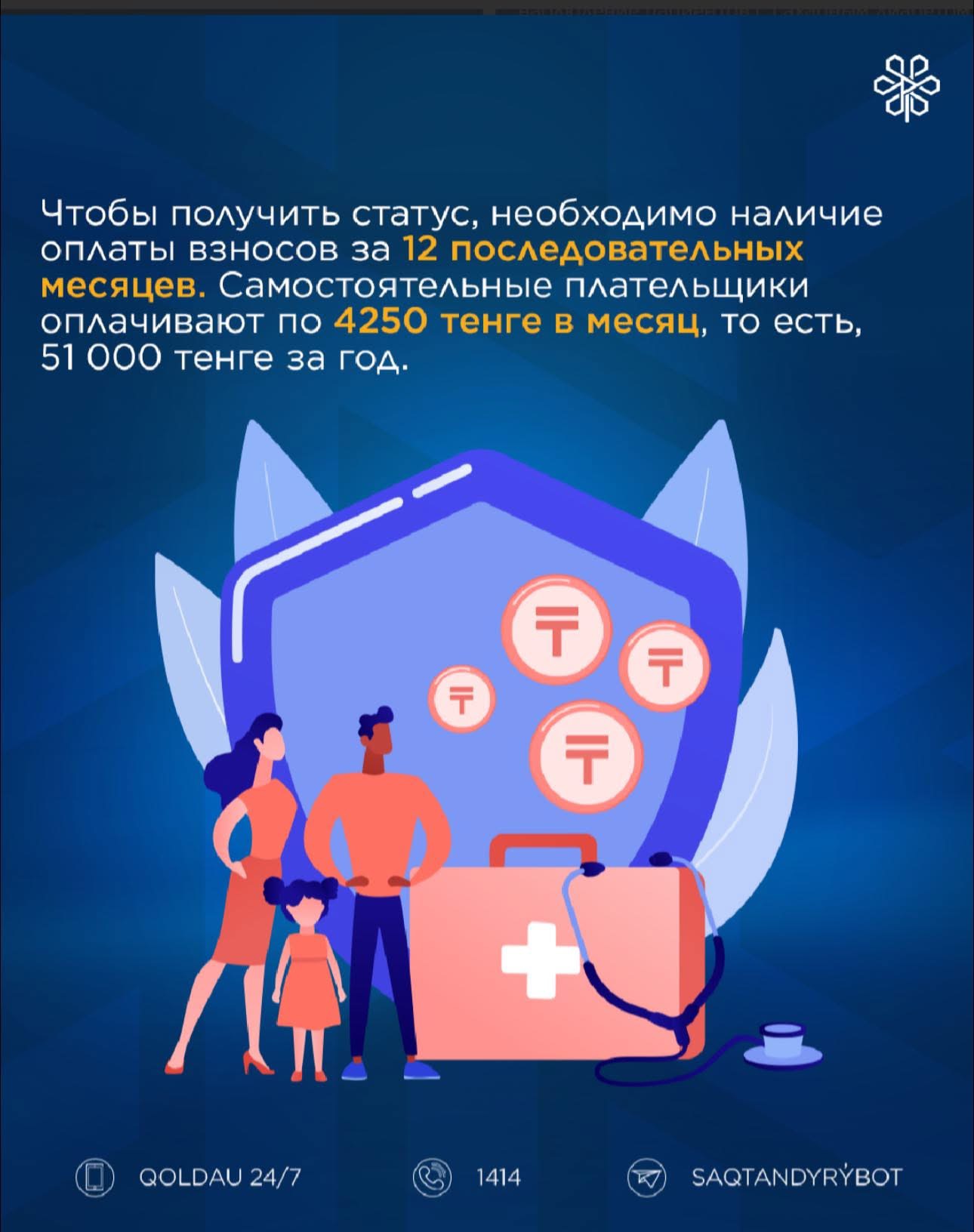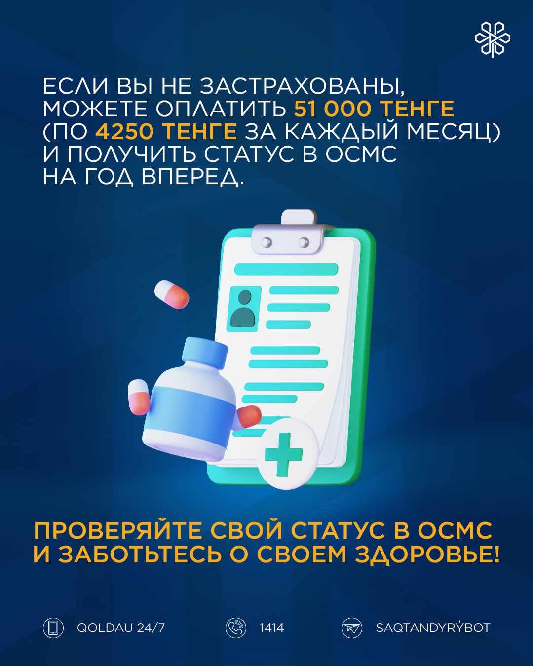 Если ранее вы были застрахованы и регулярно платили взносы, достаточно погасить задолженность за пропущенные месяцы. При наличии уплаты за последние 12 месяцев статус восстанавливается. Проверить наличие платежей можно на официальном сайте Фонда ОСМС (https://msqory.kz/ru/), через мобильное приложение Qoldau 24/7 или Telegram-бот Saqtandyry-bot.